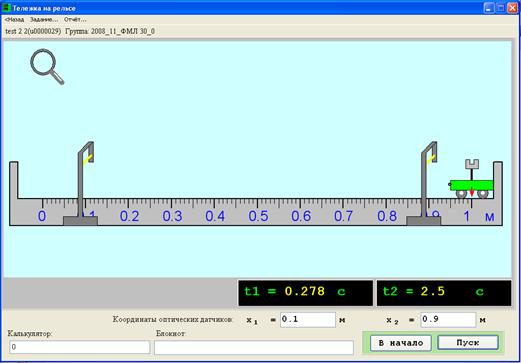 Первую стойку передвигаем в позицию x1=0.5 м, вторую (с помощью пункта ввода для x2) - в позицию x2=0.99999 м (если x2=1 м тележка не пересекает луч, поэтому ставим стойку очень близко к x=1 м). Нажимаем кнопку “Пуск” и получаем, например, t1=1.443 с, t2=2.041 с (рис.7).