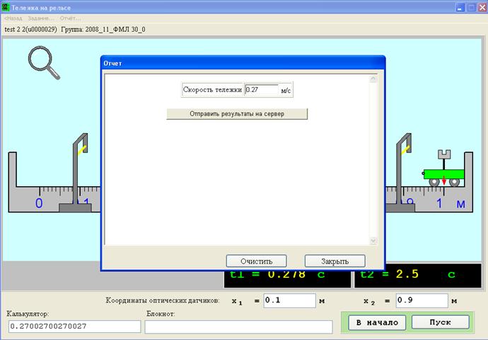 Задание 5 "Модель: Измерьте скорость тележки (8 баллов)" Задание: Измерьте с помощью оптических датчиков скорость тележки. Занесите результаты в отчёт (меню в верхней части программы) и отошлите отчёт на сервер.