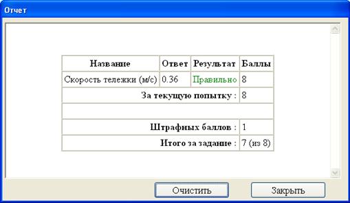 Рис.4 Результат проверки со стороны сервера При нажатии кнопки “Закрыть” любая информация в окне отчета сохраняется и показывается вновь при открытии отчета. При нажатии кнопки “Очистить” восстанавливается первоначальное состояние окна отчета с пустыми пунктами ввода. Мы можем нажать кнопку “Очистить”, затем кнопку “Закрыть”, проверить правильность наших действий и вычислений. Например, заново проделать измерения при тех же или других расстояниях между датчиками. Обнаруживаем ошибку и исправляем ее: v=(x2-x1)/(t2-t1) = (0.9-0.2)/(2.5-0.278) м/с = 0.7/2.222 м/с = 0.360036 … м/с Округляем до сотых: v=0.36 м/с. Открываем отчет, вводим ответ, отсылаем отчет на сервер и получаем: