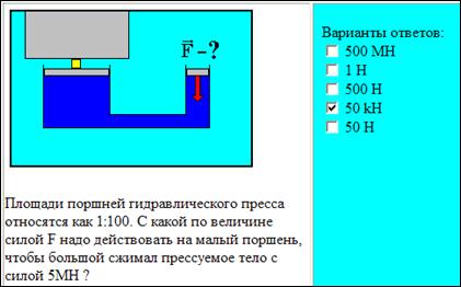 Поэтому P1=5 000 000 Н /(100 S) = 50000 Н /S. Но в силу закона Паскаля в жидкости везде наблюдается одинаковое давление, поэтому P1= P. Благодаря чему F/S = 50000 Н /S. То есть F = 50000 Н = 50 кН.