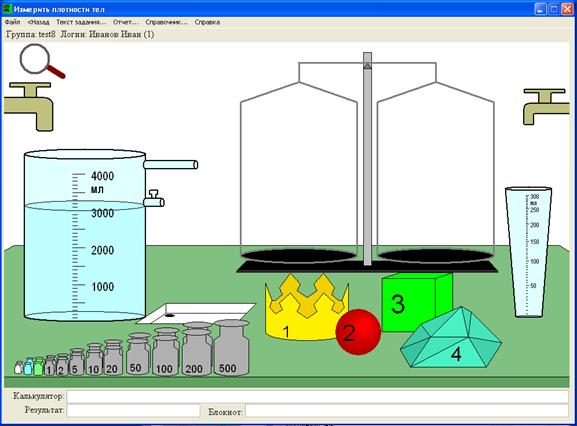 Измерьте объёмы тел (16 баллов) Найдите объём каждого из предложенных тел: 1) Короны 2) Шара 3) Куба 4) Слитка Занесите результаты в отчёт. Краны включаются и выключаются щелчком по ручке. Лишнюю воду из мерного стакана можно выливать в раковину.