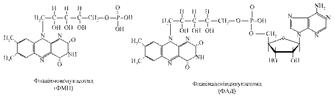 Здатність НАД+ і НАДФ+ виконувати функцію проміжного перенощика водню пов’язана з наявністю в його структурі аміду нікотинової кислоти. 3.3.2. Флавінзалежні дегідрогенази. Вони містять у своїй структурі небілковий компонент флавінове кільце – вітамін В2. Одні з них виконують функцію первинного дегідрування певних субстратів (янтарна кислота, похідні жирних кислот та інші). Вони здатні відщеплювати й приймати водневі від субстратів, при цьому виключається дія піридинзалежних дегідрогеназ. Інші оксидази можуть зразу при дегідруванні субстратів передавати протони й електрони на молекулярний кисень з утворенням пероксиду водню, забираючи від НАД·Н+ Н+.