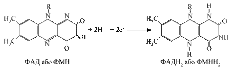 Відщепленні від НАДН+ Н+ електрони й протони (атоми водню) приєднуються до атомів азоту в 1-му і 10-му положеннях ізоалоксазинового кільця рибофлавіну, при цьому проходить переміщення подвійних спряжених зв’язків:
