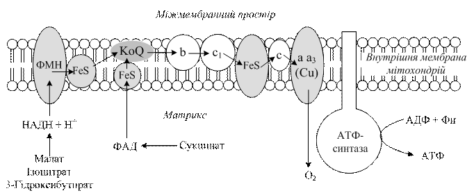 Рис. 3.3. Схема організації дихального ланцюга мітохондрій