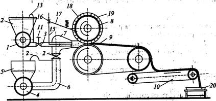 Рис. 1.1. Принципова схема пельменної машини: 1 — витіснювач фаршу; 2 — бункер для фаршу; 3 — подавальна трубка для фаршу; 4 — витіснювач тіста; 5 — бункер для тіста; 6—подавальна трубка для тіста; 7 — формувальна голівка; 8 — оббігальний барабан ведений; 9 — оббігальний барабан ведучий; 10 — транспортер для пельменів; 11 — кран регулювальний для фаршу; 12 – кран регулювальний для тіста; 13, 14 – датчики заповнення бункерів; 15 — трубка подачі масла; 16 — кран подачі масла; 17 -струшувач для борошна; 18, 19 — шибери; 20 –лоток для пельменів.