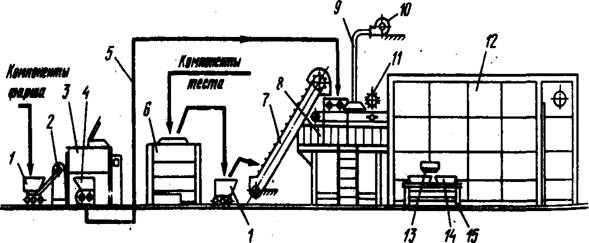 Рис. 1.3. Схема механізованої лінії по виробництву пельменів і вареників на базі швидкоморозильного апарату Я10-ОАС: 1 –візки для транспортування фаршу і тіста; 2 –гідравлічний підйомник; 3 –фаршемішалка; 4 –фаршевий насос; 5 –фаршопровід із запірною арматурою; 6 –тістомісильна машина; 7 –конвеєр для завантаження тіста; 8 –автомат П6-ФПВ; 9 –пристрій для обдування тістофаршевого джгута; 10 –вентилятор; 11 –барабан для штампування пельменів; 12 –швидкоморозильний апарат ОАС із площадкою для обслуговування; 13 –вікно для вивантаження заморожених пельменів; 14 –ємність для збору заморожених пельменів; 15 - приймальний стіл Date: 2015-07-17; view: 626; Нарушение авторских прав |