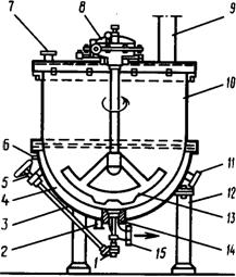 Рис.4.3. Сироповарний казан: 1- гвинтовий пристрій; 2 - штуцер для відводу конденсату; 3 - сферичне днище сорочки; 4 - парова сорочка; 5 - штурвал для відкриття спускного каналу; 6 - штуцер для виходу повітря; 7 - штуцер для подачі води; 8 - редуктор; 9 - витяжна труба; 10 - циліндр; 11 - штуцер для подачі пари в сорочку; 12 - трубчасті опори; 13 - якірна мішалка; 14 - випускний клапан; 15 - штуцер для випуску готового сиропу Казан оснащений паровою сорочкою і якірною мішалкою з електроприводом. Через верхню кришку в казан засипають цукор, а через штуцер подають воду. Вторинну пару при варінні сиропу відводять через витяжну трубу. Готовий сироп випускають через штуцер, зв'язаний з випускним клапаном. Казан установлений на трьох трубчастих опорах. На рис. 4.4 показана установка безупинного готування цукрового сиропу. 4.2.2.Колероварні казани можуть бути з вогневим і електричним обігрівом. Перші використовуються на підприємствах малої потужності. Ці казани виготовляють з чи чавуна стали місткістю 100-1000 л. Казани обладнані мішалками і витяжними пристроями. На рис. 4.5 показаний колероварний казан з електрообігріванням, що являє собою сталевий циліндр 1, усередину якого вставлений циліндр 2.