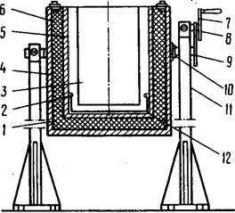 Рис. 4.5. Колероварний казан з електричним обігрівачем: 1,2 - циліндри; 3 - тигель; 4, 5 - листовий азбест; 6 - волокнистий азбест; 7 - маховик; 8, 9 - шестірні; 10 - піввісь; 11 стійки; 12- нагрівальний елемент