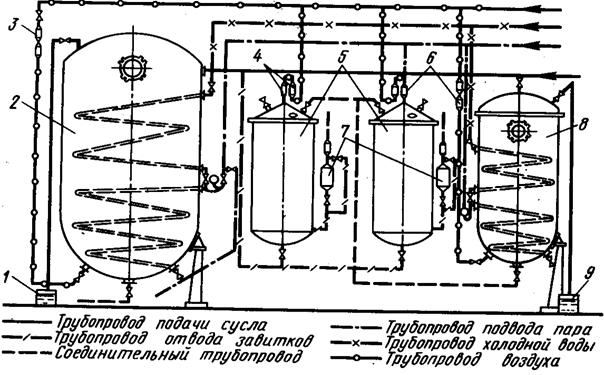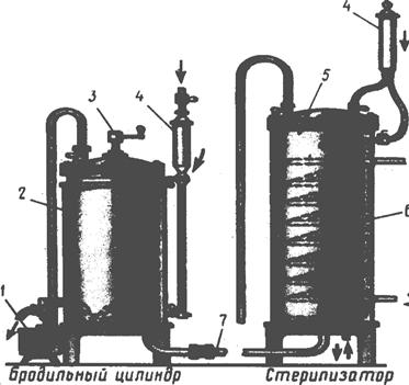 Для розведення чистих культур дріжджів і молочнокислих бактерій на підприємствах продуктивністю менш 10 тис. дал квасу в добу застосовують спеціальні установки Ганзена, а на підприємствах більшої продуктивності - установки Грейнера. Установка Ганзена (рис.4.6) складається з бродильного циліндра 2 і стерилізатора 5. Бродильний циліндр має мішалку 3, а стерилізатор - змійовик 6 для нагрівання чи охолодження сусла. Обидві ємності оснащені повітряними ватяними фільтрами 4 і трубками для відводу повітря. Для передачі стерильного сусла зі стерилізатора в бродильний циліндр мається патрубок 7, що з'єднує обидва резервуари. Сусло переміщається зі стерилізатора в бродильний циліндр тиском стерильного повітря, подаваного по повітряній трубі. Для скидання повітря бродильний циліндр має патрубок з водяним затвором 1. Розведення чистих культур дріжджів чи молочнокислих бактерій вводять у бродильний циліндр по спеціальній трубі. Місткість апаратів Ганзена від 100 до 500 л. Вихідні чисті культури в бутлях місткістю 20 л підготовляють у мікробіологічній лабораторії. Установка Грейнера (рис.4.7) має стерилізатор 8 місткістю 650 л, що служить для готування стерильного сусла. Він забезпечений двома змійовиками, один із яких (нижній) служить для нагрівання, інший - для охолодження.