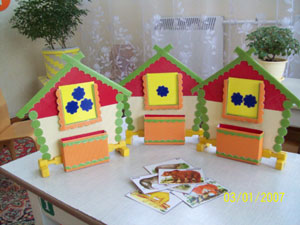 Можно просто использовать картинки, названия которых состоят их разного количества слогов. Ребёнок берёт карточку, называет изображённую на ней картинку, определяет количество слогов в слове и самостоятельно вставляет в соответствующий кармашек домика в зависимости от количества цветов в окошке.