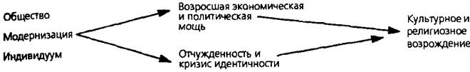 На рис. 3.1 показана диаграмма, которая рисует все эти три курса. Отторжение останется в точке А; кемализм будет продвигаться по диагонали к точке В; реформатор будет двигаться горизонтально к точке С. Однако по какому пути на самом деле двигались эти общества? Конечно же, каждое не-западное общество следует своим собственным курсом, который может значительно отличаться от этих трех путей-прототипов. Мазруи даже утверждает, что Египет и Африка двигались к точке D сквозь «болезненный процесс культурной вестернизации без технической модернизации» В тех пределах, в которых любая обобщенная модель модернизации и вестернизации существует в качестве ответной реакции не-западных обществ на влияние Запада, она будет находиться в рамках кривой А—Е. Изначально модернизация и вестернизация тесно связаны, и не-западные общества, впитывая значительные элементы западной культуры, достигают прогресса на пути к модернизации. Однако с увеличением темпов модернизации удельный вес вестернизации снижается и происходит возрождение местных культур. Дальнейшая модернизация, таким образом, изменяет цивилизационный баланс власти между Западом и не-западным обществом и усиливает приверженность местной культуре. Таким образом, во время ранних этапов изменений, вестернизация поддерживает модернизацию. На более поздних этапах модернизация стимулирует возрождение местной культуры. Это происходит на двух уровнях. На социальном уровне модернизация усиливает экономическую, военную и политическую мощь общества в целом и заставляет людей этого общества поверить в свою культуру и утверждаться в культурном плане. На индивидуальном уровне модернизация порождает ощущение отчужденности и распада, потому что разрываются традиционные связи и социальные отношения, что ведет к кризису идентичности, а решение этих проблем дает религия. Этот процесс упрощенно показан на рисунке 3.2. Эта гипотетическая общая модель соответствует как социологической теории, так и историческому опыту. Подробно изучив имеющиеся факты в области «гипотезы инвариантности», Райнер Баум пришел к выводу, что «вечные человеческие размышления над мерой признания авторитетов и осознание личной независимости происходят исключительно по культурным сценариям. В этих вопросах нет тенденции к межкультурной гомогенизации мира. Напротив, создается впечатление, что есть некая инвариантность в этих моделях, которые развились в четкие формы во время исторического и раннего современного этапа развития» [41]. Теория заимствования, разработанная такими учеными, как Фробениус, Шпенглер и Боземен, помимо прочего, делает акцент на том, насколько избирательно цивилизация-реципиент совершает заимствования из других цивилизаций и адаптирует, трансформирует и ассимилирует их, чтобы усилить и обеспечить выживание базовых