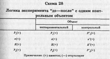 Введем следующие условные обозначения основных параметров экспериментальной процедуры: х — экспериментальная переменная (испытываемый фактор, который также обозначают как "независимую'* переменную); К -— неконтролируемые переменные (ии в одном эксперименте не удается полностью контролировать все условия» поэтому остается влияние неучтенных факторов); PJ — состояние объекта до введения экспериментальной переменной, измеренное по какой-то процедуре; Р2 — состояние объекта в конце эксперимента, после введения переменной х, d — наблюдаемое в итоге эксперимента изменение. Рассмотрим простейший вариант экспериментирования с контрольным объектом. (1) Эксперимент типа "до — после" с одним контрольным объектом — обычный вариант социального экспериментирования (схема 28). d=(Pt— P2)—(jP'2— P\), и тогда изменение представ-ляет функцию экспериментального фактора плюс влияние неконтролируемых условий, т.е. d = f(x + К—К'). Бели же неконтролируемые условия в обеих группах выравнены (перестали быть неконтролируемыми), т. е. К=К\, тогда d=f(x+K-K')=f(x) Практически ни в одной серии не удается целиком устранить воздействие К. Поэтому следует повторять экспериментирование до тех пор, пока не будет получен статистически устойчивый результат. Иными словами, К к К' будут выравнены на основе закона больших чисел.