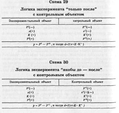 Способы минимизации влияния К мы уже знаем. Будем пытаться устранить возмущающее воздействие первых замеров (Р^ и Р\). (3) Эксперимент типа "только после" с контрольным объектом (схема 28). Очевидно, что, поскольку мы избежали первого замера, реактивное воздействие, связанное с вмешательством экспериментатора (исследователя), упразднено. При этом, конечно, сохраняются все требования к выравниванию условий и к повторным сериям для получения устойчивого результата. (4) Эксперимент типа "якобы до—после" с контрольной группой (схема 30). В этом эксперименте, хотя первый замер на контрольной группе осуществлялся, он не влияет на результат, так как не было вторичного замера. Разница между экспериментами типа (3) и (4) в том, что в последнем нам не потребуется искать объект (бригаду), на котором не вводится новая система организации труда, так как в контрольной группе испытуемая переменная может быть или не быть — она не влияет на итог. Практически это важно, так как экспериментирование с людьми всегда имеет моральный аспект. Так, введение новых условий труда на всем предприятии, за исключением одного цеха, может быть воспринято как дискриминация.