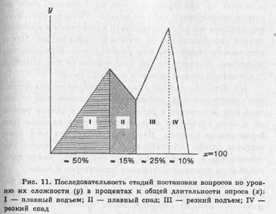(д) Обычно в заключение выражается благодарность за сотрудничество в проведении опроса. Часто это повторная благодарность, так как во введении пишут: "Заранее благодарим Вас за сотрудничество". Динамика развития опроса — анкетного или интервью, — продолжительность которого варьирует в зависимости от цели и содержания исследования от десяти-пятнадцати минут до полутора-двух часов, в целом выглядит так (рис. 11): в первой половине опроса — плавный подъем, примерно 15% времени уделено "отдыху" (спад), затем около четверти времени самой напряженной работы (к этому моменту респондент включился в опрос и подготовлен к серьезному обдумыванию своих ответов) и резкое снижение трудностей в завершающей фазе24. Верстка анкеты25 должна отвечать требованиям простоты и удобства работы и для опрашиваемого, и для кодировщика. 24 В содержательной работе Ю. П. Воронова, на наш взгляд, неправомерно рекомендуется заканчивать опрос "на подъеме" [39. С.46—48]. Эксперименты Г. А. Погосяна [208. С. 108] подтверждают более низкий интерес респондента в начале и конце опроса. 25См. пример верстки анкеты в приложении.