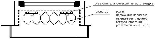 Практический совет. Подоконная доска с длинным выносом может препятствовать попаданию горячего потока воздуха от радиатора отопления к поверхности окна. Следует придерживаться правила, что подоконная доска должна закрывать не больше 1/3 части радиатора (рис. 8).