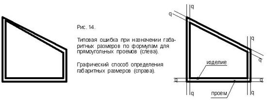 Для пластиковых окон, имеющих форму трапеций, треугольников, с углами, не равными 90?, ранее приведённая расчёт L = Lпр - 2*q и Н = Нпр - 2*q (см. рис. 14) не используется.