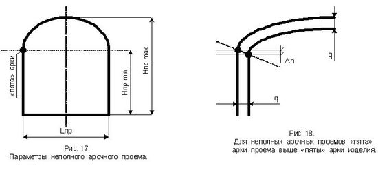 - определите положение «пяты» арки, последовательно измеряя ширину проема при увеличении высоты, сделайте отметку; - измерьте Нпр min, Нпр max, Lпр; - определите габаритные размеры арочного изделия графическим способом (назначение габаритных размеров по формулам для полной арки не рекомендуется из-за некоторого смещения «пяты» арки изделия относительно «пяты» арки проема, см. рис. 18). - для справки: для неполной арки радиус определяется по формуле