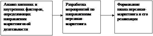 1. ориентация на рассмотрение задач и функций маркетинга в широком смысле: под маркетингом персонала в данном случае понимается определенная философия и стратегия управления человеческими ресурсами, а персонал (работающий и потенциальный) рассматривается в качестве внешних и внутренних клиентов организации, т.е. маркетинг персонала рассматривается как элемент кадровой политики, реализуемый через комплекс задач управления персоналом. Персонал-маркетинг нацелен на “продажу” организации своим сотрудникам путем создания максимально благоприятных условий труда, содействующих повышению его эффективности и развитию партнерского отношения и лояльности в каждом сотруднике. 2. в узком смысле персонал – маркетинг рассматривается как особая функция службы управления персоналом, направленная на выявление и покрытие потребностей организации в кадровых ресурсах. Основные функции маркетинга персонала: ¾ исследование рынка для определения текущих и перспективных потребностей организации в персонале; ¾ анализ развития производства для своевременной подготовки новых рабочих мест и требований к сотрудникам; ¾ поиск и приобретение персонала, соответствующего целям и требованиям организации ¾ создание и пополнение информационной базы данных по персоналу по всем целевым группам; данная функция включает в себя изучение требований, предъявляемых к должности и рабочим местам. Основная задача маркетинга персонала («персонал-маркетинга») – владение ситуацией на внутреннем и внешнем рынке труда для своевременного и эффективного покрытия потребности в рабочей силе и реализации тем самым тактических, оперативных и стратегических задач организации. Маркетинговая деятельность в области персонала представляет собой комплекс взаимосвязанных этапов по формированию и реализации плана персонал-маркетинга. Схему основных этапов маркетинговой деятельности в области персонала можно проиллюстрировать на рис.