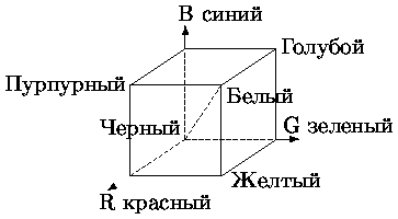 Рис. Модель RGB Система координат RGB – куб с началом отсчета (0,0,0), соответствующим черному цвету (см. рис. 0.4.1). Максимальное значение RGB – (1,1,1) соответствует белому цвету.