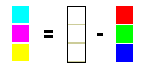 Рис. Получение модели CMY из RGB Цвета, использующие белый свет, вычитая из него определенные участки спектра называются субтрактивными. Основные цвета этой модели: голубой (белый минус красный), фуксин (в некоторых книгах его называют пурпурным) (белый минус зеленый) и желтый (белый минус синий). Эти цвета являются полиграфической триадой и могут быть легко воспроизведены полиграфическими машинами. При смешение двух субтрактивных цветов результат затемняется (в модели RGB было наоборот). При нулевом значении всех компонент образуется белый цвет (белая бумага). Эта модель представляет отраженный цвет, и ее называют моделью субтрактивных основных цветов. Данная модель является основной для полиграфии и также является аппаратно–зависимой.