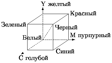 Рис. Модель CMY Система координат CMY – тот же куб, что и для RGB, но с началом отсчета в точке с RGB координатами (1,1,1), соответствующей белому цвету. Цветовой куб модели CMY показан на рис. 0.4.2.