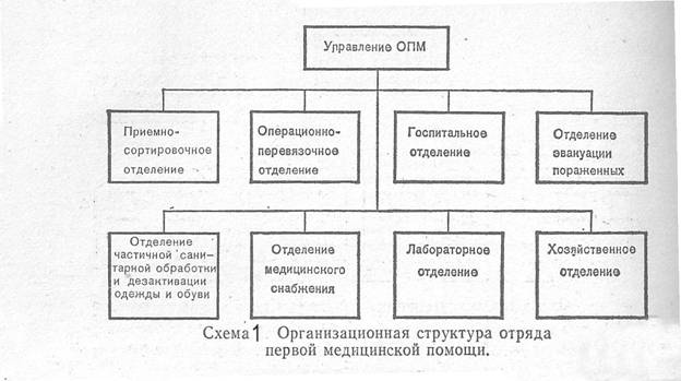Численность личного состава ОПМ 143 человека, в том числе: Ø врачей - 9 человек; Ø среднего медперсонала - 63 человека. В составе ОПМ имеются следующие отделения: Ø приемно-сортировочное; Ø операционно-перевязочное; Ø госпитальное; Ø эвакуационное; Ø частичной санитарной обработки и дезактивации одежды и обуви; Ø медицинского снабжения (аптеки); Ø лабораторное; Ø хозяйственное. Из техники к ОПМ приписываются: 13 грузовых автомобилей, 1 легковой, 1 мотоцикл, подвижная электростанция, радиостанция Р-105 (Р-109). ОПМ, полностью укомплектованный кадрами и оснащенный табельным имуществом мобилизационного резерва, относится к формированиям повышенной готовности. За 24 часа работы ОПМ может оказать первую врачебную помощь 1000 пораженным. Крупным недостатком ОПМ является его громоздкость, низкая материальная и техническая готовность к действиям в условиях современной войны. Поэтому в настоящее время разработана перспективная модель нового мобильного медицинского отряда МС ГО (ММО) — бригадного состава, предназначенного для оказания первой врачебной помощи пораженным. ММО отличается компактностью и обладает более высокой мобильностью, чем ОПМ. Отряд первой медицинской помощи (ОПМ) является одним из основных подвижных формирований МС ГО, предназначенных для оказания первой врачебной помощи населению, пострадавшему от оружия массового поражения. На отряд первой медицинской помощи возлагаются следующие задачи: Ø ведение медицинской разведки в районе размещения ОПМ в загородной зоне, на маршруте движения и в очаге поражения; Ø проведение частичной санитарной обработки пораженных и частичной дезактивации их одежды и обуви; Ø прием, медицинская сортировка пораженных; Ø оказание первой врачебной помощи пораженным и неотложной хирургической (по жизненным показаниям) помощи (при возможности); Ø временная, госпитализация нетранспортабельных больных; Ø временная изоляция инфекционных больных и пораженных с острыми психическими расстройствами; Ø подготовка пораженных к эвакуации в лечебные учреждении загородной зоны; Ø проведение простейших лабораторных исследований и дозиметрического контроля; Ø обеспечение медицинским имуществом СД, работающих на закрепленных за ОПМ объектами; Ø организация питания пораженных, находящихся в ОМП; Ø ведение медицинского учета и отчетности. В очаге поражения отряд развертывается в сохранившихся зданиях на территории с допустимыми уровнями радиации с учетом наличия подъездных путей, необходимых для эвакуации пострадавших, а также обеспечения противорадиационной защиты личного состава ОПМ и пораженных. При ликвидации очага химического поражения отряд развертывается на незараженной территории с учетом направления господствующих ветров во избежание заноса ими ОВ. При ликвидации очага химического поражения в отряде дополнительно осуществляются следующие мероприятия: