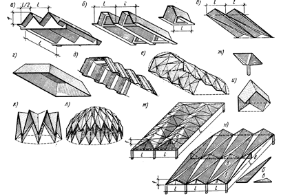 Складки и шатры – это пространственные покрытия, образованные плоскими взаимно пересекающимися элементами (рис.7.7). Складки обычно состоят из ряда повторяющихся в определенном порядке поперек пролета элементов, опирающихся по краям на диафрагмы жесткости. Шатры перекрывают прямоугольное в плане пространство смыкающимися кверху с четырех сторон плоскостями. Толщина плоского элемента складки должна быть не менее 1/200 пролета, высота – 1/20, а ширина грани – 1/5 пролета. Их применяют для зданий пролетом до 40 м.