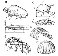 Пространственные покрытия от плоскостных отличаются тем, что тонкая плита оболочки работает преимущественно на сжатие, а растягивающие усилия рационально сосредоточены в контурных элементах, причем все эти элементы работают в разных плоскостях. Основными видами пространственных покрытий являются оболочки, складки и висячие и пневматические шатры. Оболочки бывают одинарной и двоякой кривизны. Первые представляют собой цилиндрические или конические поверхности. Оболочки двоякой кривизны могут быть либо оболочками вращения с криволинейной образующей (купол, гиперболический параболоид, эллипсоид вращения и др.). По структуре оболочки бывают гладкие, волнистые, ребристые и сетчатые (рис.7.6). Они могут быть выполнены как монолитными, так и сборными. В сборных конструкциях помимо железобетона используются асбестоцемент, металл и пластик. Ребристыми являются оболочки, у которых тонкая криволинейная стенка усилена ребрами. Сетчатые оболочки состоят только из ребер или из стержней, промежутки между которыми заполняются ненесущим материалом (стеклопластиком, пленкой и др.). Гладкие железобетонные оболочки делают всегда монолитными. При изготовлении монолитных оболочек наиболее сложным является подготовка криволинейной опалубки и устройство лесов, что сопряжено со значительным расходом материалов и большими трудозатратами. Железобетонные и металлические оболочки применяют для устройства покрытий пролетом до 100 м, а иногда и более.