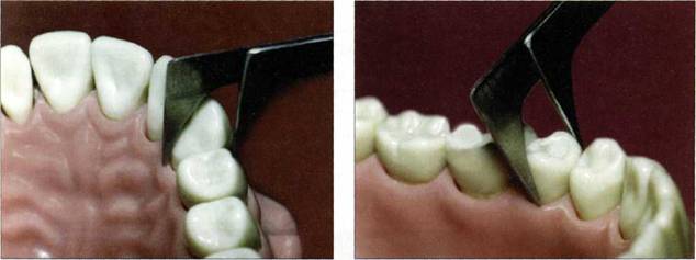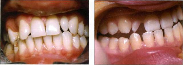 При исполнении реставрационных работ особая настороженность требуется при лечении пациентов, имеющих прямой прикус. При данном виде смыкания зубных рядов режущие края верхних зубов не перекрывают нижних, попадая прямо, подобно щипцам, на их режущие края. Истирание режущих краев передней группы зубов при этом виде прикуса достаточно быстрое (рис. 157).