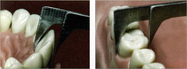При измерении вестибулолингвального размера коронок фронтальной группы зубов (резцы, клыки), а также премоляров верхней и нижней челюстей одонтометр устанавливается в вертикальное положение, с охватом наиболее выступающих точек вестибулярной и лингвальной поверхностей (рис. 92-94). При измерении вестибулолингвального размера коронок верхних моляров положение одонтометра вертикальное, захвачены наиболее выступающие поверхности в области переднего щечного и переднего небного бугров (рис. 95). На нижних молярах измерение вестибулолингвальных диаметров производится дважды: между наиболее выступающими точками переднего щечного и переднего язычного бугров, а также между наиболее выступающими точками заднего щечного и заднего язычного бугров. Наибольший по величине показатель является вестибулолингвальным параметром коронки (рис. 96). ХАРАКТЕРИСТИКА ЗУБОЧЕЛЮСТНОЙ СИСТЕМЫ ПРИ ПРОВЕДЕНИИ ХУДОЖЕСТВЕННОЙ РЕСТАВРАЦИИ ЗУБОВ
