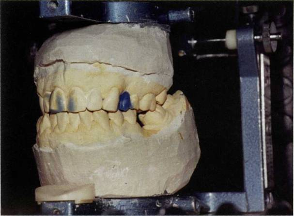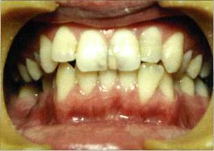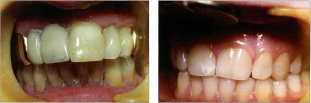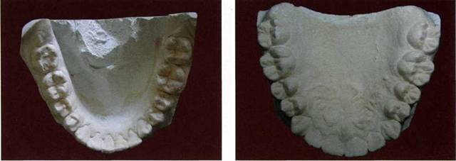 Достаточно сложным при выполнении реставрационных работ является глубокое резцовое перекрытие. Тесный контакт вестибулярных и режущих поверхностей нижних резцов и клыков с небными поверхностями группы передних верхних зубов приводит к установлению такого вида артикуляции при котором происходит физиологическое стирание. Наиболее отчетливо оно проявляется на вестибулярных поверхностях нижних резцов. Возможно так же стирание группы моляров и премоляров, что характеризуется уменьшением жевательных бугров и углублением окклюзионных фасеток (рис. 160-162). При открытом прикусе контактируют между собой чаще всего группы жевательных зубов, коронки же переднего участка разобщены. Опыт работы с пациентами, имеющими данный вид прикуса, показывает, что восстановление коронок зубов в переднем отделе как верхней, так и нижней челюстей не представ-