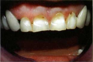 При гипоплазии и флюорозе отмечается пятнистость, меловая, желто-коричневая пигментация (рис. 150). При травме сосудисто-нервного пучка коронка сереет, при кровоизлиянии — розовеет. Необратимые изменения цвета происходят в результате лечения зубов препаратами с окрашивающим эффектом (резорцин-формалиновый метод, метод серебрения, неаккуратное применение эндометазона и т.д.) (рис. 151-153). Присутствие мягких или твердых зубных отложений также меняет цвет нижележащих тканей, что часто дезинформирует врача-рес- Рис. 149