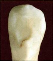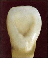 1. Язычная поверхность резцов плоская или равномерно вогнута, краевые гребешки не выраже 2. Краевые гребешки слабо выражены и не доходят до окклюзионной трети коронки (рис. 128). 3. Краевые гребешки хорошо выражены с обеих сторон и по всей высоте коронки зуба (рис. 129). 4. Краевые гребешки сильно выражены и между ними имеется углубление язычной поверхнос