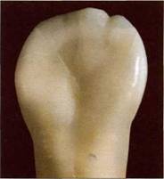 Рис. 97. Демонстрирует, как меняется форма коронки нижнего моляра при несоблюдении основных морфологических пропорций. Известно, что изменение формы коронки даже одного зуба приводит к нарушению функционального состояния как зуба, так и всей зубочелюстной системы. Это важно помнить при восстановлении формы зубов, зубных рядов Известно, что форма зуба содержит в себе достаточное количество информации. В норме форма коронки соответствует групповой принадлежности. Эмаль гладкая, без трещин и других деформаций. Опытный одонтолог, оценивая конфигурацию твердых тканей коронок, может предположить состояние здоровья пациента в период развития и формирования молочных и постоянных зубов. Такие заболевания, как гипоплазия, флюороз, гиперплазия зубов, нарушают структуру эмали, при этом изменяется форма коронок (рис. 98-106). ХАРАКТЕРИСТИКА ЗУБОЧЕЛЮСТНОЙ СИСТЕМЫ ПРИ ПРОВЕДЕНИИ ХУДОЖЕСТВЕННОЙ РЕСТАВРАЦИИ ЗУБОВ