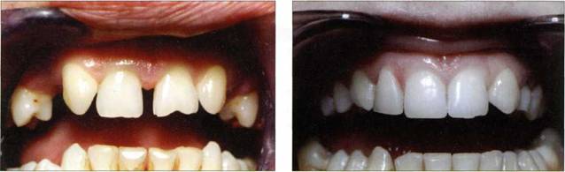 Рис. 158 Рис. 159 носится к аномалиям зубных рядов, восстановление коронок зубов переднего отдела челюстей с помощью композиционных материалов несет в себе меньше трудностей, чем восстановление зубов при глубоком резцовом перекрытии. Существующее свободное пространство заполняется композиционной массой и при последующем функционировании не выбивается зубами-антагонистами.