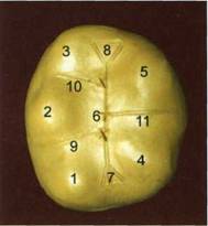 Рис.214 Рис.215 Рис.216 Рис. 214 — 216. 1 — медиовестибулярый или передний щечный бугорок, протоконид (prd); 2 — дистовестибулярный или задний щечный бугорок, или гипоконид (hyd); 3 — дистальный или задний бугорок, или гипоконулид (hid), или мезоконид; 4 — ме-диолингвальный или передний язычный бугорок, или метаконид (med); 5 — дистолингвальный или задний язычный бугорок, или энтоконид (end); 6 — продольная борозда; 7 — передняя триангулярная ямка; 8 — задняя триангулярная ямка; 9 — вестибулярная борозда; 10 — дистовестибулярная борозда; 11 — лингвальная борозда Наиболее объемным является передний щечный бугорок (1), наименьшим — дистальный (3), между ними располагается задний щечный (2),язычные бугорки (4, 5) занимают примерно равные площади на жевательной поверхности. Продольная борозда (6) не доходит до апрокси-мальных краев, заканчиваясь триангулярными ямками (медиальной 7, дистальной 8), и делит жевательную поверхность на две неравные части: большую вестибулярную, меньшую лингвальную. Поперечные борозды переходят на вестибулярную (9 — вестибулярная борозда, 10 — дистовестибулярная борозда) и лингвальную (11 -лингвальная борозда) поверхности. Учитывая вышеизложенные принципы формообразования коронок зубов из модулей — одонтомеров, начинаем моделирование. Центральное положение вестибулярной части жевательной поверхности нижнего правого первого моляра (рис. 217) занимает дистальный щечный бугорок. Последовательно выстраиваются основные морфологические элементы: продольный валик (2), занимающий значительную площадь, и менее выраженные: медиальный (10) и дистальный (11) валики. Валики разделяются между собой незначительными углублениями ПРОСТРАНСТВЕННОЕ МОДЕЛИРОВАНИЕ ЗУБОВ