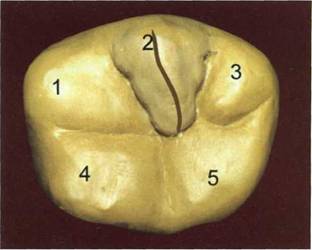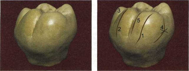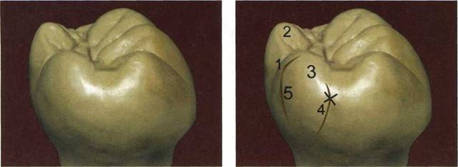 Рис. 226 Рис. 227 Рис. 226—227. 1 — продольный гребень переднего щечного бугорка; 2 — продольный гребень заднего щечного бугорка; 3 — задний бугорок; 4 — медиальный гребень переднего щечного бугорка; 5 — дистальный гребень заднего щечного бугорка ПРОСТРАНСТВЕННОЕ МОДЕЛИРОВАНИЕ ЗУБОВ