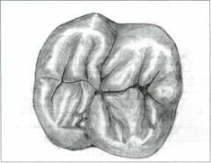 Таким образом, длина коронки превалирует над ее шириной. Имеющийся расчет соотношений частей в определенных пропорциях помогает исполнителю сделать заготовку первого моляра нижней челюсти достаточных размеров для последующей работы с ней. Далее размечаем фиссуры. Для этого на жевательную поверхность наносим сетку, благодаря которой выделяются ячейки, в которых в последующем будут располагаться основные бугорки (модули — одонтомеры)(рис. 214-216).