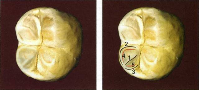 Рис. 256 Рис. 257 Рис. 257. 1 — медиальный щечный бугорок; 2 — дистальный щечный бугорок; 3 — медиальный язычный бугорок; 4 — дис-тальный язычный бугорок; 5 — медиальный дополнительный бугорок; 6 — дистальный дополнительный бугорок ХУДОЖЕСТВЕННОЕ МОДЕЛИРОВАНИЕ И РЕСТАВРАЦИЯ ЗУБОВ