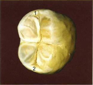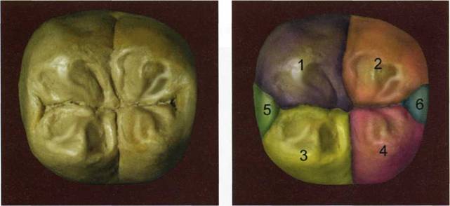 Жевательная поверхность первого моляра в большинстве случаев представлена четырьмя бугорками (одонтомерами), которые, объединяясь между собой, образуют борозду первого порядка, напоминающую Н-образную конфигурацию, форма коронки при этом приобретает очертания куба. Демонстрируется жевательная поверхность 16 зуба (рис. 258, 259). Для лучшего видения модулей-одонтомеров путем тонирования и цифрового обозначения выделены отдельные морфологические зоны жевательной поверхности (рис. 260).