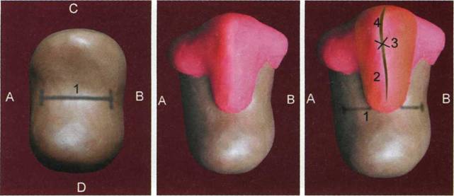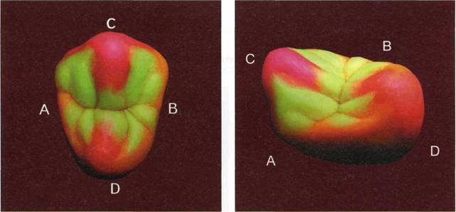 Рис. 452. А — медиальная сторона; В — дистальная сторона; С — вестибулярная сторона; D — небная сторона. 1 — продольный валик вестибулярного одонтомера; 2 — рвущий бугор вестибулярного одонтомера; 3 — продольный валик небного одонтомера; 4 — рвущий бугор небного одонтомера Далее приступаем к формированию медиальной части жевательной поверхности (рис. 453,454). От вершин рвущих бугров щечного (1) и небного (2) одонтомеров по краю жевательной поверхности выкладываем медиальный краевой гребень (7), пересеченный медиальной бороздой (8). Между основными продольными валиками обоих одонтомеров и медиальным краевым гребнем (7), по разные стороны от центральной фиссуры (6), располагаем медиальные валики соответствующих одонтомеров (медиальный валик щечного одонтомера — (9), медиальный валик небного одонтомера — (10)). Сформированные основные морфологические элементы медиальной части жевательной поверхности разделены между собой незначительными углублениями. Аналогично медиальной поверхности оформляется дистальная часть жевательной поверхности (рис. 455, 456). Постепенно выкладывается хорошо выраженный дистальный краевой гребень, со-