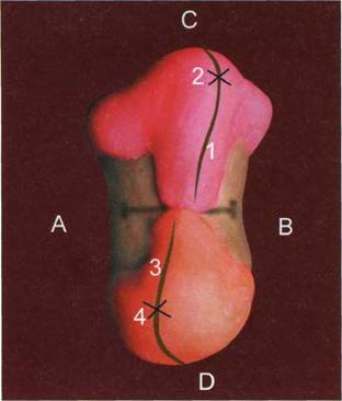 Рис. 445 Рис. 446 Рис. 447 Рис. 445—447. А — медиальная сторона; В — дистальная сторона; С — вестибулярная сторона; D — небная сторона; 1 — центральная фиссура; 2 — продольный валик; 3 — рвущий бугор вестибулярного одонтомера; 4 — гребень продольного валика ПРОСТРАНСТВЕННОЕ МОДЕЛИРОВАНИЕ ЗУБОВ