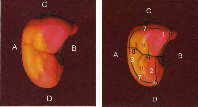 Рис. 453 Рис. 454 Рис. 453—454. А — медиальная сторона; В — дистальная сторона; С — вестибулярная сторона; D — небная сторона. 1 — вестибулярный одонтомер; 2 — небный одонтомер; 3 — медиальная часть жевательной поверхности; 4 — продольный валик вестибулярного одонтомера; 5 — продольный валик небного одонтомера; б — межбугорковая фиссура; 7 — краевой медиальный гребень; 8 — медиальная борозда; 9 — медиальный валик вестибулярного одонтомера; 10 — медиальный валик небного одонтомера ПРОСТРАНСТВЕННОЕ МОДЕЛИРОВАНИЕ ЗУБОВ