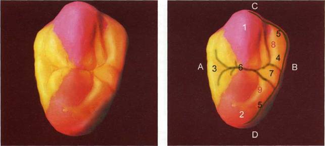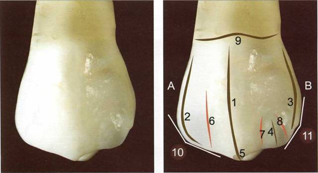единяющий между собой вершины рвущих бугров обоих одонтомеров (5). Дистальная часть межбугорковой фиссуры (6) пересекает краевой гребень двумя веточками, образуя при этом дополнительный дистальный бугорок (7). Между продольными валиками обоих одонтомеров и дистальными частями краевого гребня (5) по разным сторонам от центральной фиссуры сформированы дистальный валик вестибулярного одонтомера (8) и дистальный валик небного одонтомера (9). Небная поверхность верхнего левого первого премоляра формируется достаточно сглаженной, лишенной гребней и фиссур (рис. 457, 458).