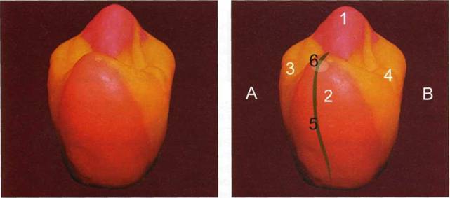 Рис. 457 Рис. 458 Рис. 458. А — медиальная сторона; В — дистальная сторона; 1 — вестибулярный одонтомер; 2 — небный одонтомер; 3 — медиальная часть жевательной поверхности; 4 — дистальная часть жевательной поверхности; 5 — продольный валик небного одонтомера; 6 — рвущий бугор небного одонтомера ХУДОЖЕСТВЕННОЕ МОДЕЛИРОВАНИЕ И РЕСТАВРАЦИЯ ЗУБОВ