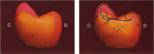 1 — продольный валик вестибулярного одонтомера; 2 — медиальный валик вестибулярного одонтомера; 3 — продольный валик небного одонтомера; 4 — небная ветвь межбугорковой фиссуры; 5 — вестибулярная ветвь межбугорковой фиссуры; 6 — медиальный валик небного одонтомера; 7 — анатомическая шейка ПРОСТРАНСТВЕННОЕ МОДЕЛИРОВАНИЕ ЗУБОВ
