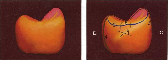 Рис. 475. Рис. 476 Рис. 476. А — медиальная сторона; В — дистальная сторона; С — вестибулярная сторона; D — небная сторона; 1 — вестибулярный одонтомер; 2 — небный одонтомер; 3 — медиальный одонтомер; 4 — дистальный одонтомер; 5 — межбугорковая борозда ХУДОЖЕСТВЕННОЕ МОДЕЛИРОВАНИЕ И РЕСТАВРАЦИЯ ЗУБОВ