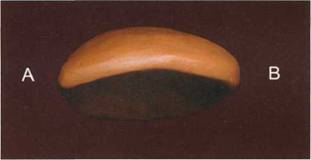 Рис. 628. Рис. 626—628. А — медиальная сторона; В — дистальная сторона Рис. 627 Со стороны контактных медиальной (рис. 629) и дистальной (рис. 630) поверхностей заготовка имеет вид клина, верхушка которого обращена к режущему краю, основание к — десневому краю. Таким образом, изначально задан объем коронки зуба, ограниченный габаритными очертаниями (высота коронки, ширина коронки, толщина коронки), выставленными и смоделированными заранее (рис. 631, 632).