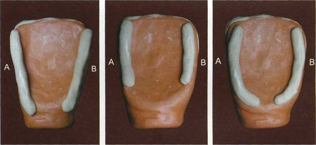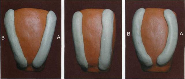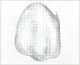 Индивидуальность же форм создается уже на следующих этапах моделирования. Демонстрируется расположение краевых валиков по вестибулярной поверхности: при конвергирующих валиках форма центрального резца напоминает треугольное очертание (рис. 633), при параллельно располагающихся валиках- прямоугольное очертание (рис. 634), при округло выраженных валиках, когда наиболее выраженная ширина коронки находится в средней ее трети, форма коронки овальная (рис. 635). Положение и направление краевых валиков не только меняют форму вестибулярной поверхности, но и ограничивают также контактные грани. Рисунки демонстрируют, как меняется форма коронки центрального резца при различных позициях краевых валиков, хотя габаритные очертания культи остаются неизменными, заданы стандартно.