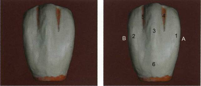 Рис. 640 Рис. 641. А — медиальная сторона; В — дистальная сторона. 1 — медиальный валик; 2 — дистальный валик; 3 — продольный валик; 4 — медиальное углубление; 5 — дистальное углубление; 6 — экватор ровано три основных валика: продольный (3), медиальный (1), дистальный (2), которые в клинической анатомии соответствуют эмалево-дентиновым валикам (мамелонам). На границе средней и пришеечной трети валики объединяются между собой, образуя экватор зуба (6). После моделирования основных валиков определяются практически параллельно друг другу расположенные медиальное (4) и дистальное (5) углубления, напоминающие формы бороздок, ограничивающиеся средней третьей частью вестибулярной поверхности и образующие на режущем крае соответствующие вырезки (медиальную, дистальную). После того как основные элементы сформированы, приступаем к окончательному этапу моделирования вестибулярной поверхности. Объединяем все анатомические зоны между собой, воссоздаем микрорельеф, создаем более тонкую градацию вестибулярной поверхности (рис. 642-647).